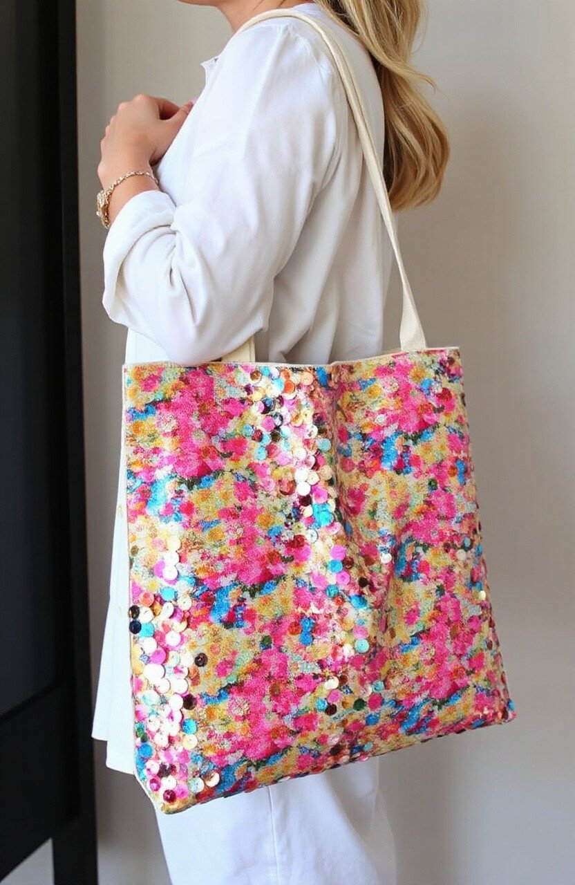 This bag is perfect for shopping, school, or work, adding a touch of shine to your day. It’s easy to personalize with colors and designs that reflect your style. Plus, it’s a fun way to update an old tote.