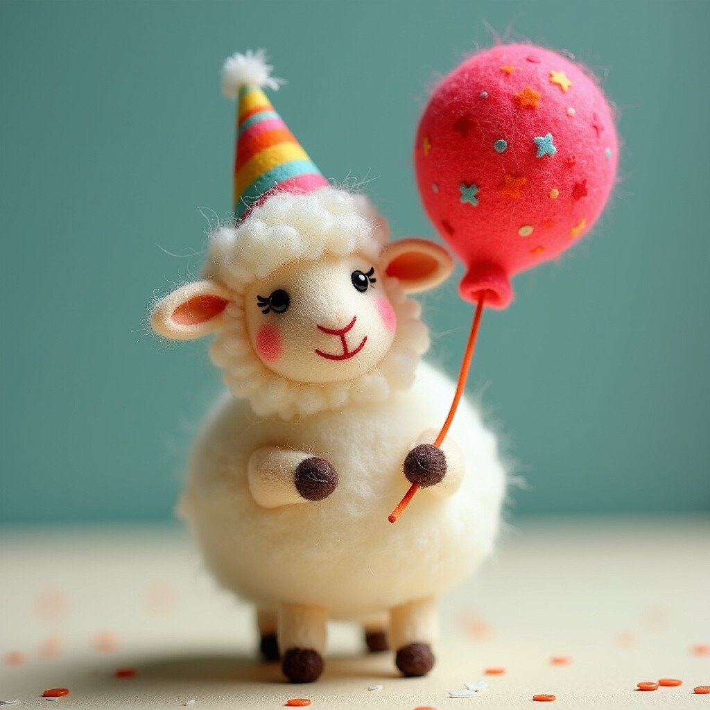 This festive sheep is ready to celebrate, holding a colorful felted balloon. It’s a joyful decoration for parties or birthdays.
