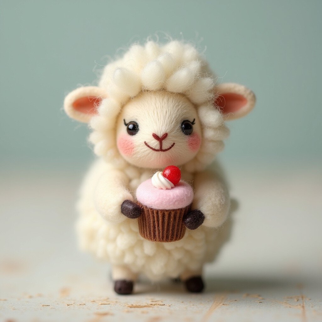 Sweet and charming, this baker sheep holds a tiny felted cupcake. It’s a delightful addition to any kitchen or bakery-themed decor.