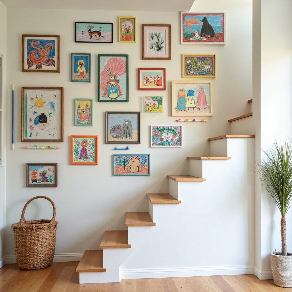 Celebrate your child’s creativity by dedicating a section of your staircase wall to their artwork. Frame their colorful masterpieces and watch the space come alive with joy and imagination. It’s a fantastic way to encourage their artistic talents.