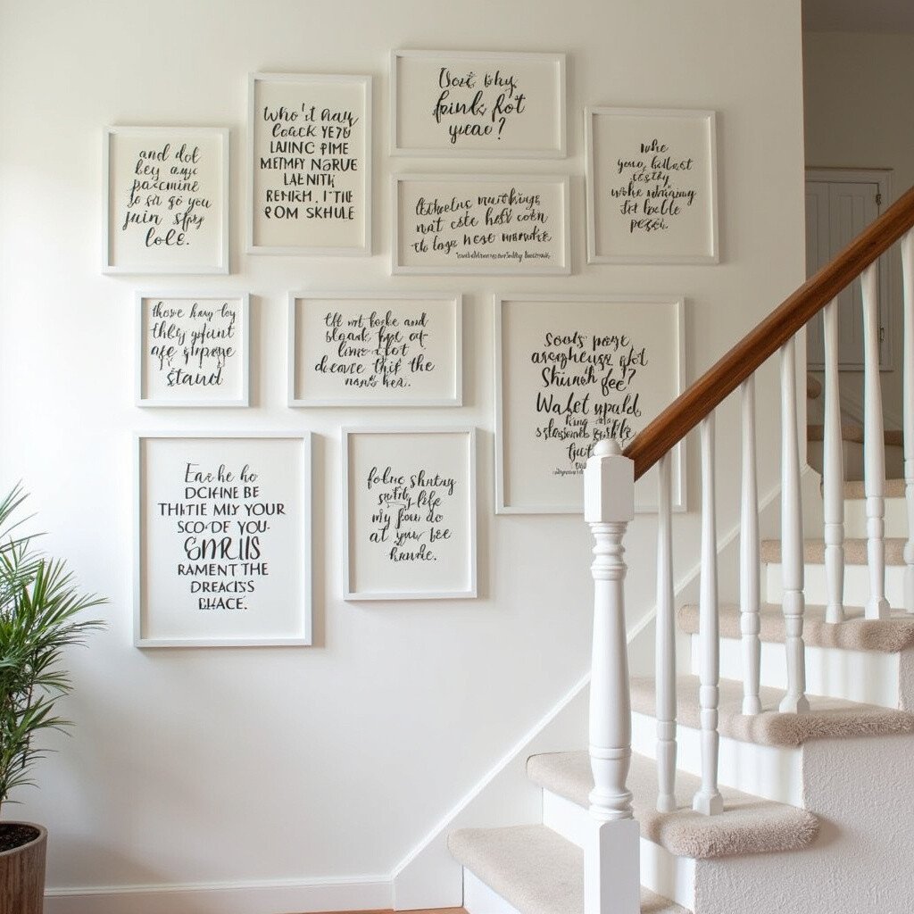 Incorporate motivational quotes alongside your pictures for a daily dose of inspiration. Use decorative typography or handwritten notes to add a personal touch. This idea makes your staircase wall not just beautiful, but also uplifting.