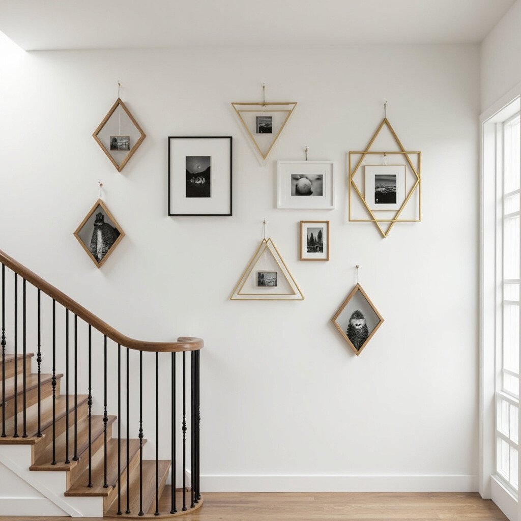 Arrange your frames in geometric patterns for a modern and artistic look. Triangles, diamonds, or hexagons create visual interest and a contemporary feel. This innovative approach turns your picture wall into a piece of art.