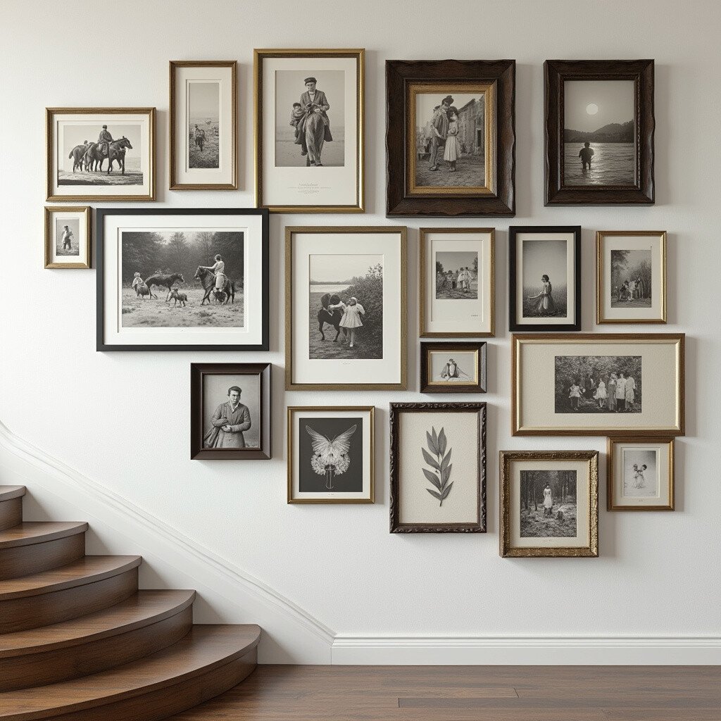 Unleash your inner artist by combining frames of different shapes, sizes, and colors. This bold approach adds an eclectic vibe that can make your staircase wall pop with personality. Mix old family photos with modern art prints for a unique fusion.