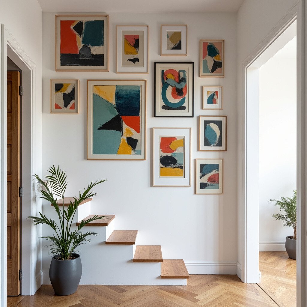 Turn your staircase wall into a modern art gallery with abstract prints and paintings. This bold choice adds intrigue and sophistication to your home. The vibrant colors and shapes can energize the space and spark creativity.