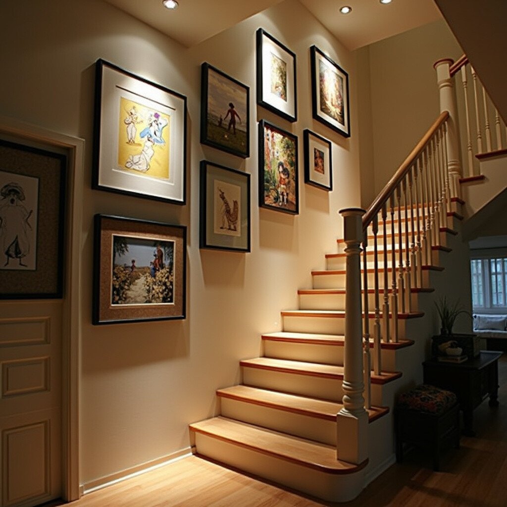 Lighting is an excellent way to enhance the visual impact without altering the art itself. It’s especially effective in dimly lit staircases, making the area inviting and warm. This option may require a small investment, but the results are stunning.