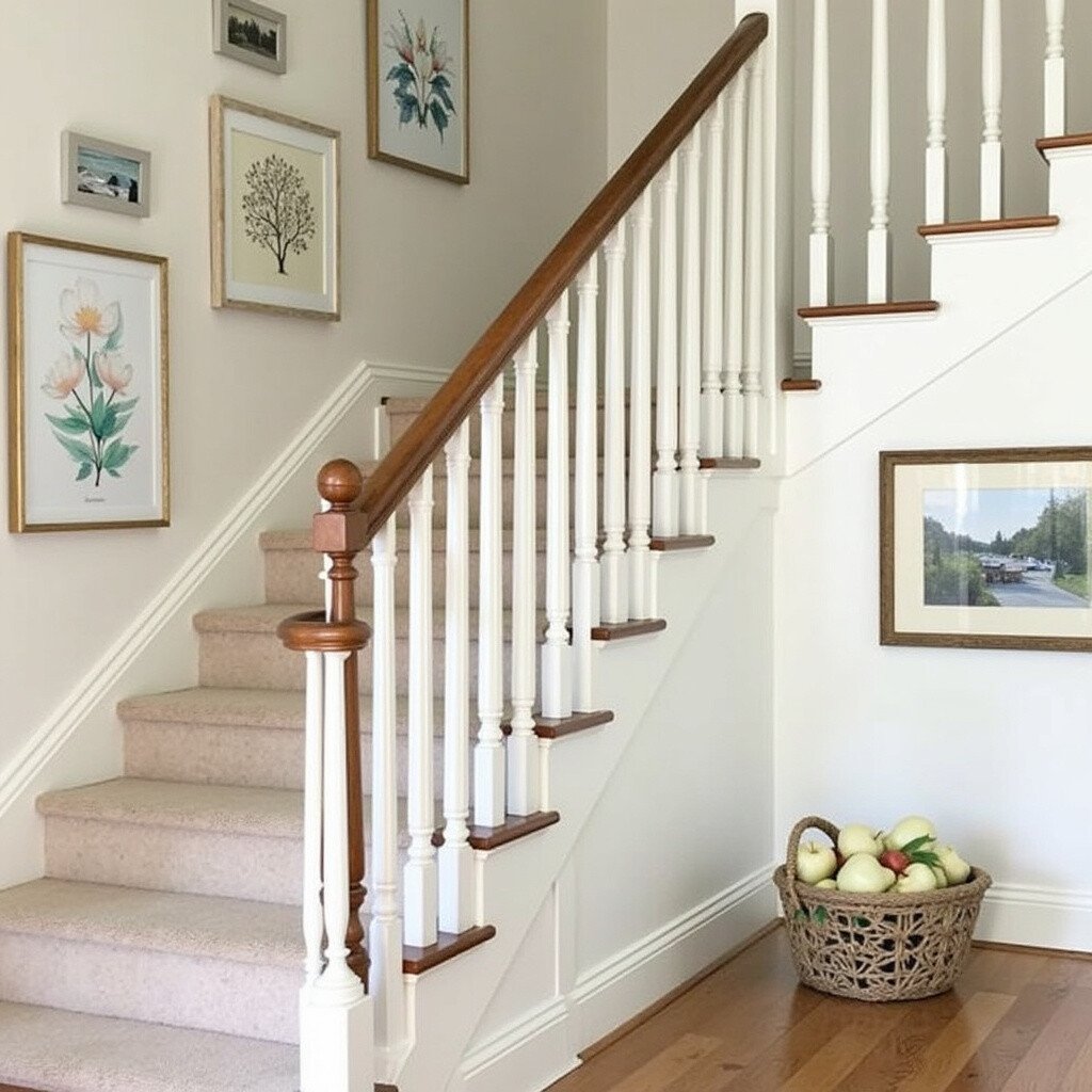 Keep your staircase wall fresh by changing the pictures with the seasons. Rotate between spring blossoms, summer beaches, autumn leaves, and winter snow scenes. This idea keeps the decor lively and in tune with the time of year.