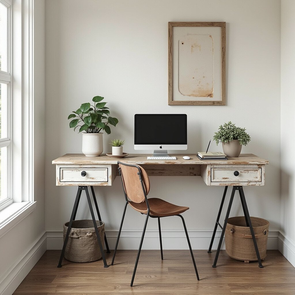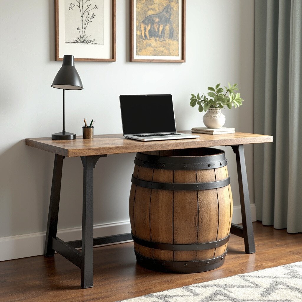 Imagine using a rustic barrel as your desk base. It’s unique and gives a strong farmhouse feel. Place a round or rectangular tabletop on top, and you’ve got a one-of-a-kind desk.