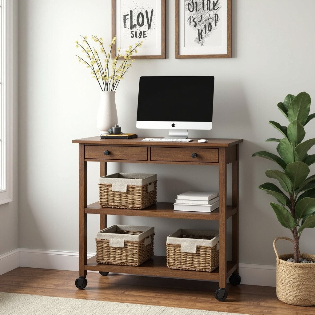 Personalize by adding baskets or trays for storage. It’s affordable and adds a unique element to your workspace. Plus, it’s fun to roll around!