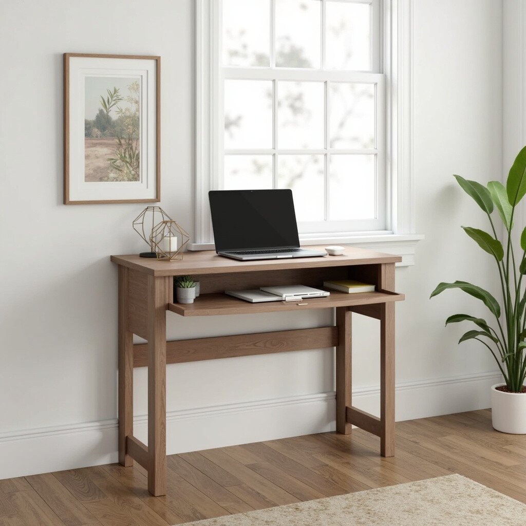 Picture a wooden ladder transformed into a stunning standing desk. It’s perfect for small spaces, leaning against the wall without taking up much room. The natural wood adds a cozy, farmhouse feel.