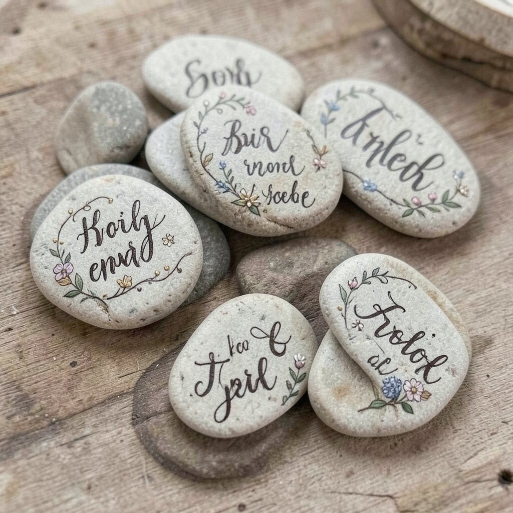 Name stones are thoughtful and unique. Use elegant fonts and add small embellishments. They’re great for weddings, gardens, or as a personalized gift for friends and family!