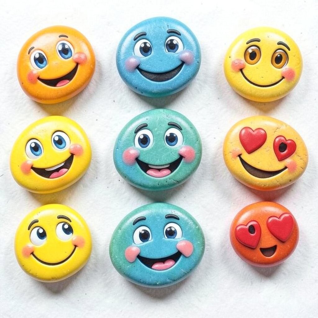 Emoji stones are super fun and make everyone smile. Use bright colors and clear shapes. These are perfect for kids or as a playful desk accessory!