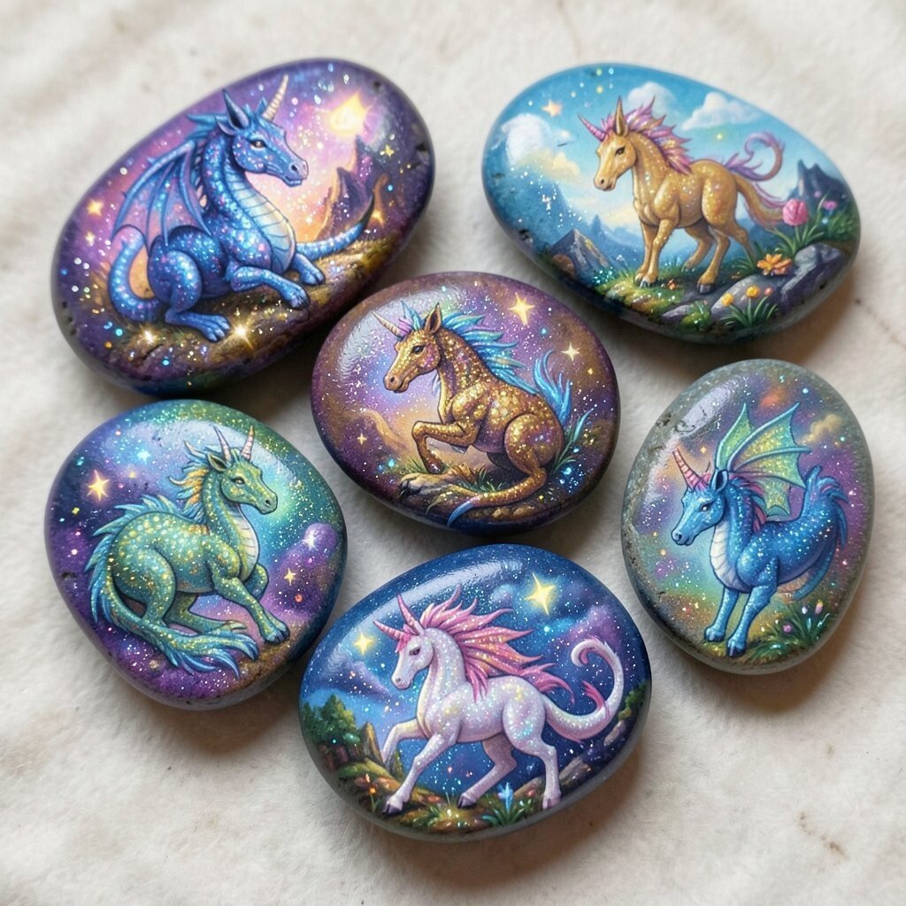 Use vibrant colors and shimmering paints to make your creatures magical. Add glitter for extra sparkle. This is a fun project to do with friends or family, and each stone tells its own story.