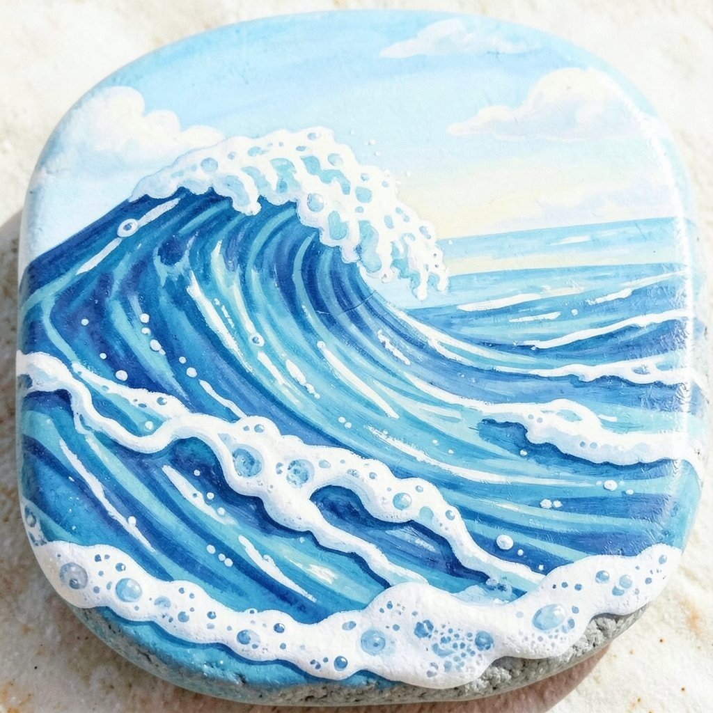 The soothing colors and flowing patterns make this project both calming and beautiful. Use a dabbing technique to create foam on the waves. Ideal for summer decoration or as a gift for ocean lovers!