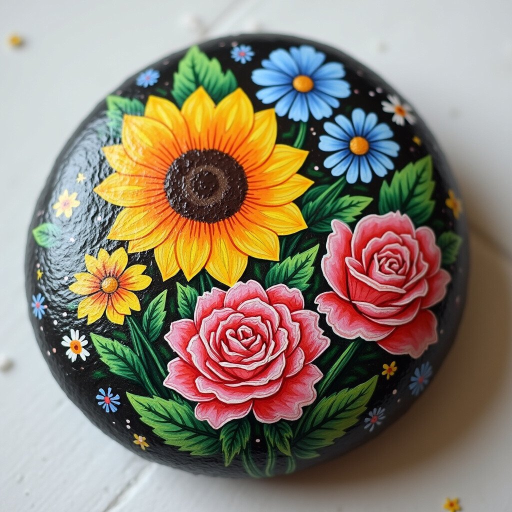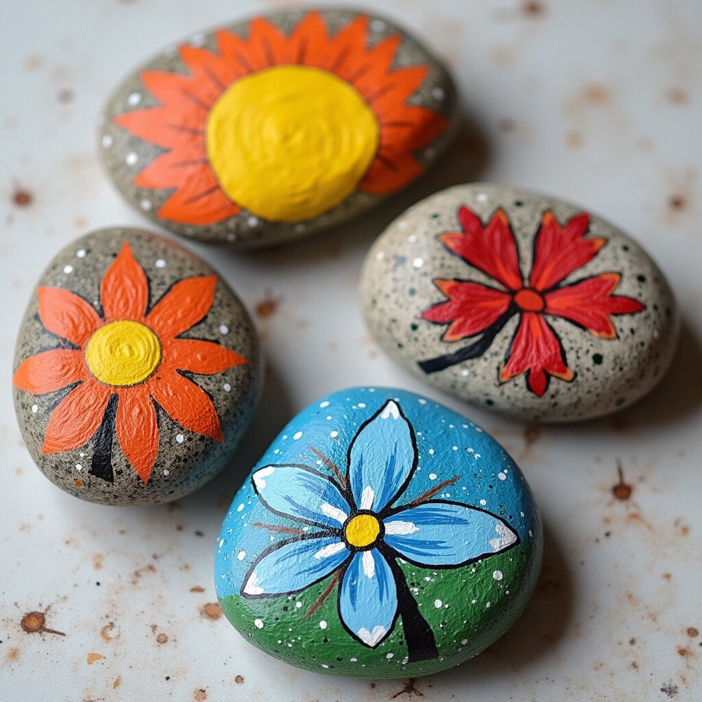 Bring a burst of color to your stones with floral designs. Paint vibrant flowers like daisies, roses, or sunflowers. These stones are perfect for adding a touch of nature to your home.