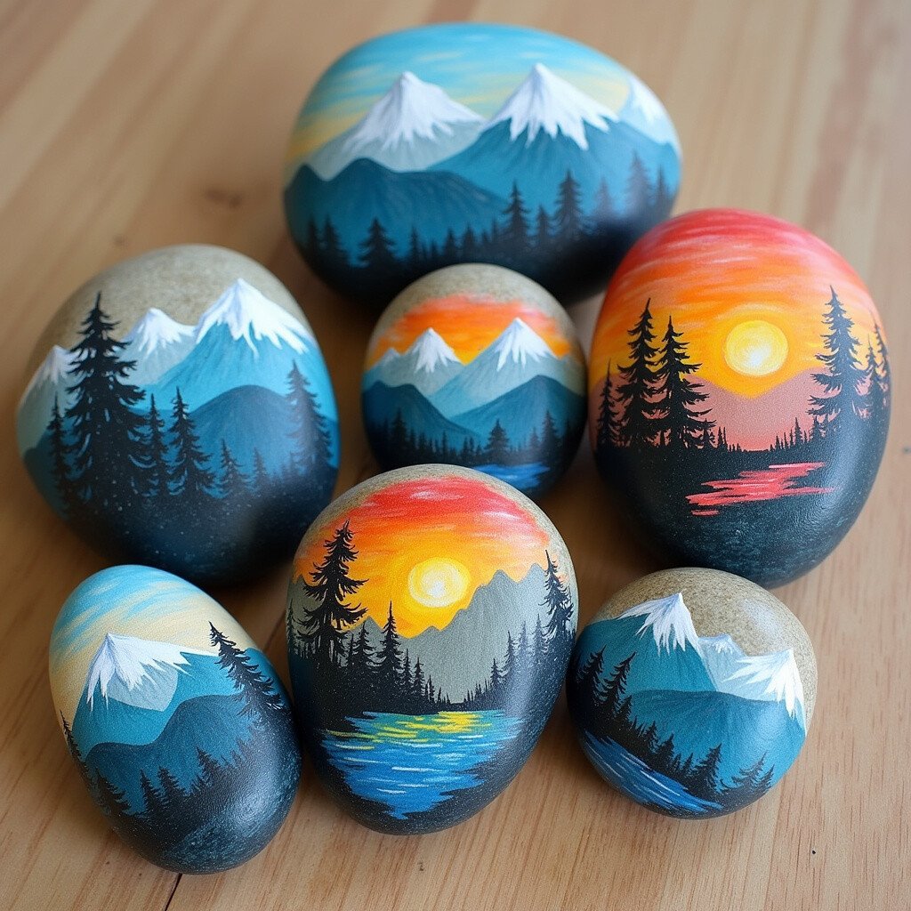 Paint stones with beautiful nature scenes like mountains, forests, or sunsets. Use colors that reflect the beauty of the natural world. These stones are perfect for nature lovers.