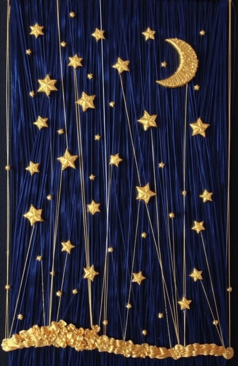 Capture the magic of a starry night sky with this enchanting design. Use dark blue or black threads as the backdrop, with golden or silver strings for the stars.