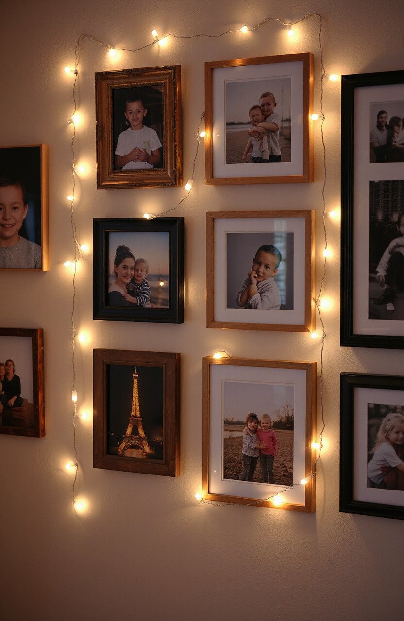 Wrap string lights around picture frames to highlight your favorite memories. It adds a cozy glow to your gallery wall.