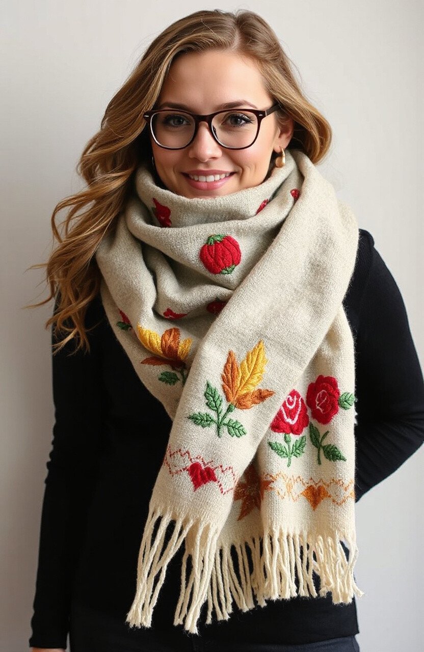 Keep cozy with an embroidered scarf that tells a story. It’s like wrapping yourself in a warm piece of art. This idea is perfect for those chilly days.