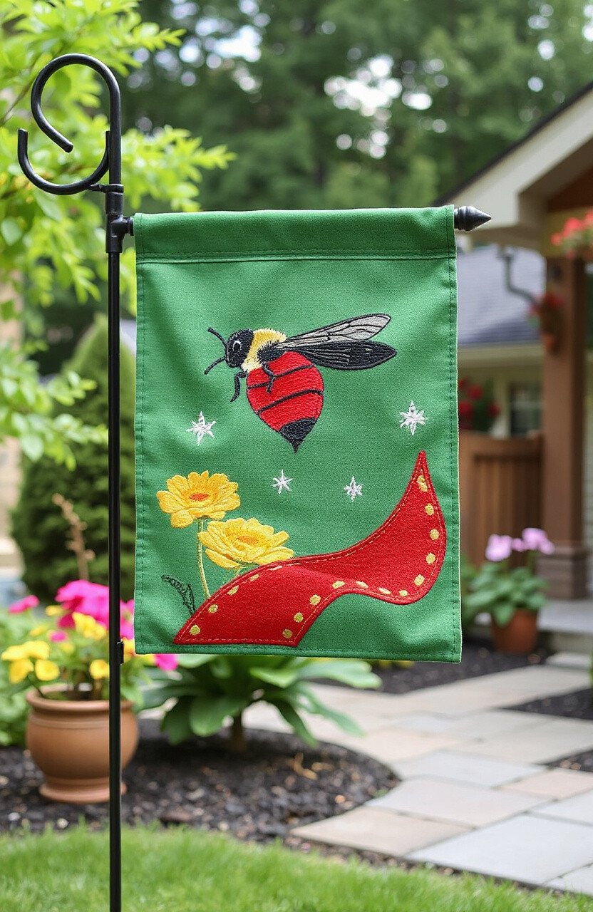 Welcome guests with a charming embroidered garden flag. It’s like rolling out the red carpet in your backyard! This idea is perfect for adding a personal touch to your outdoor space.
