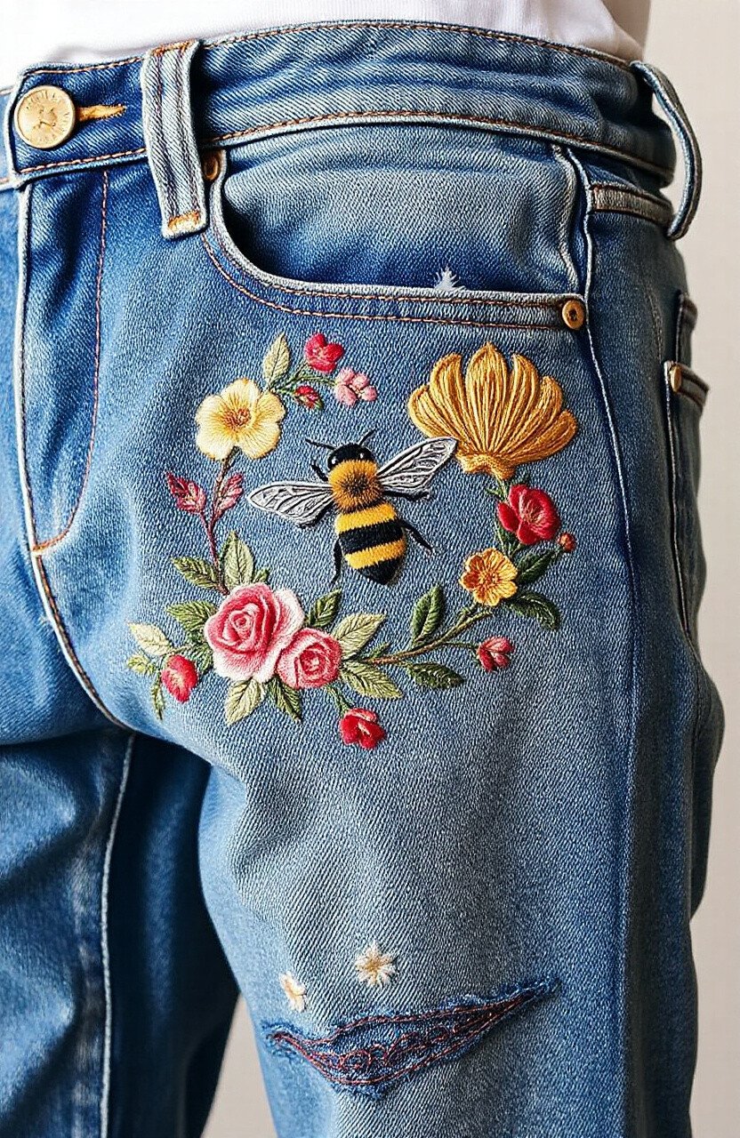 Turn your ordinary jeans into a fashion statement with embroidery. It’s like giving them a stylish makeover. This idea is perfect for those who want to stand out.