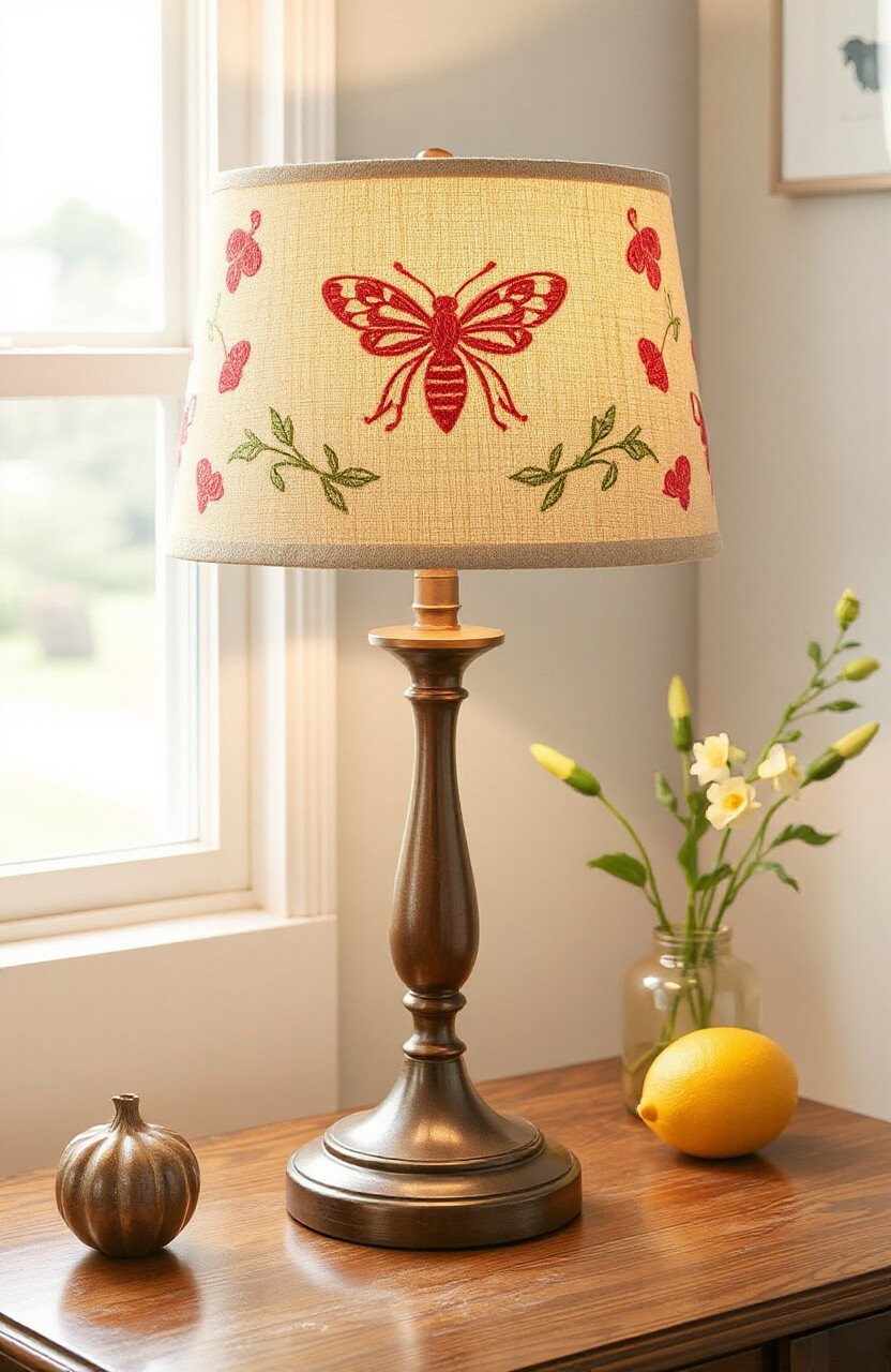 Light up your room with an embroidered lampshade. It’s like casting a cozy glow with a touch of art. This idea is perfect for adding character to your living space.
