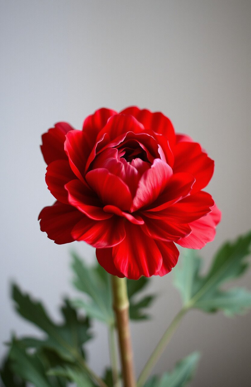 The Radiant Ruby Ranunculus is rich and vibrant. Its deep red color is mesmerizing.