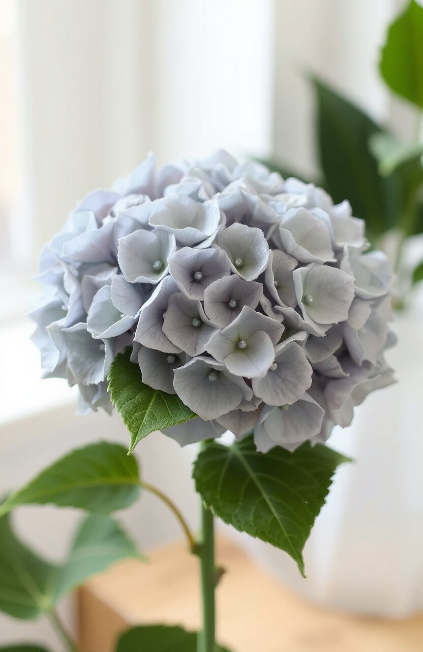 The Misty Grey Hydrangea offers a cool, calming effect. Its unique grey shade makes it a standout piece.