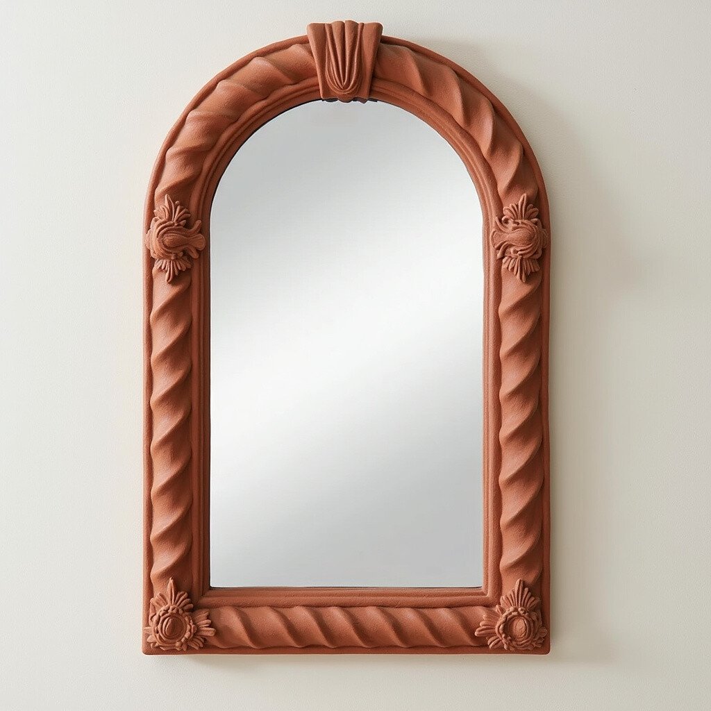 A mirror framed with terracotta offers both functionality and style. Its rustic frame adds a touch of cottagecore charm.