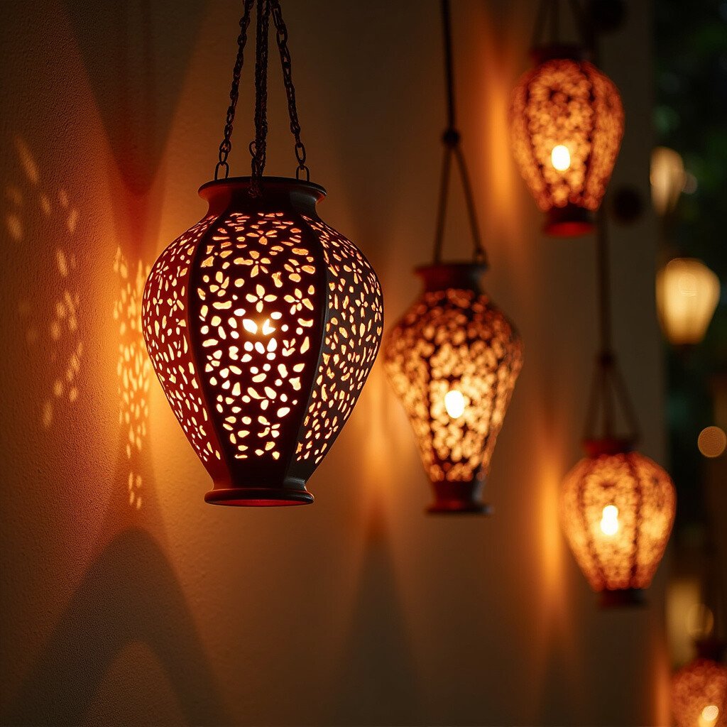 Hanging lanterns made from terracotta create a cozy ambiance. When lit, they cast beautiful patterns of light and shadow.