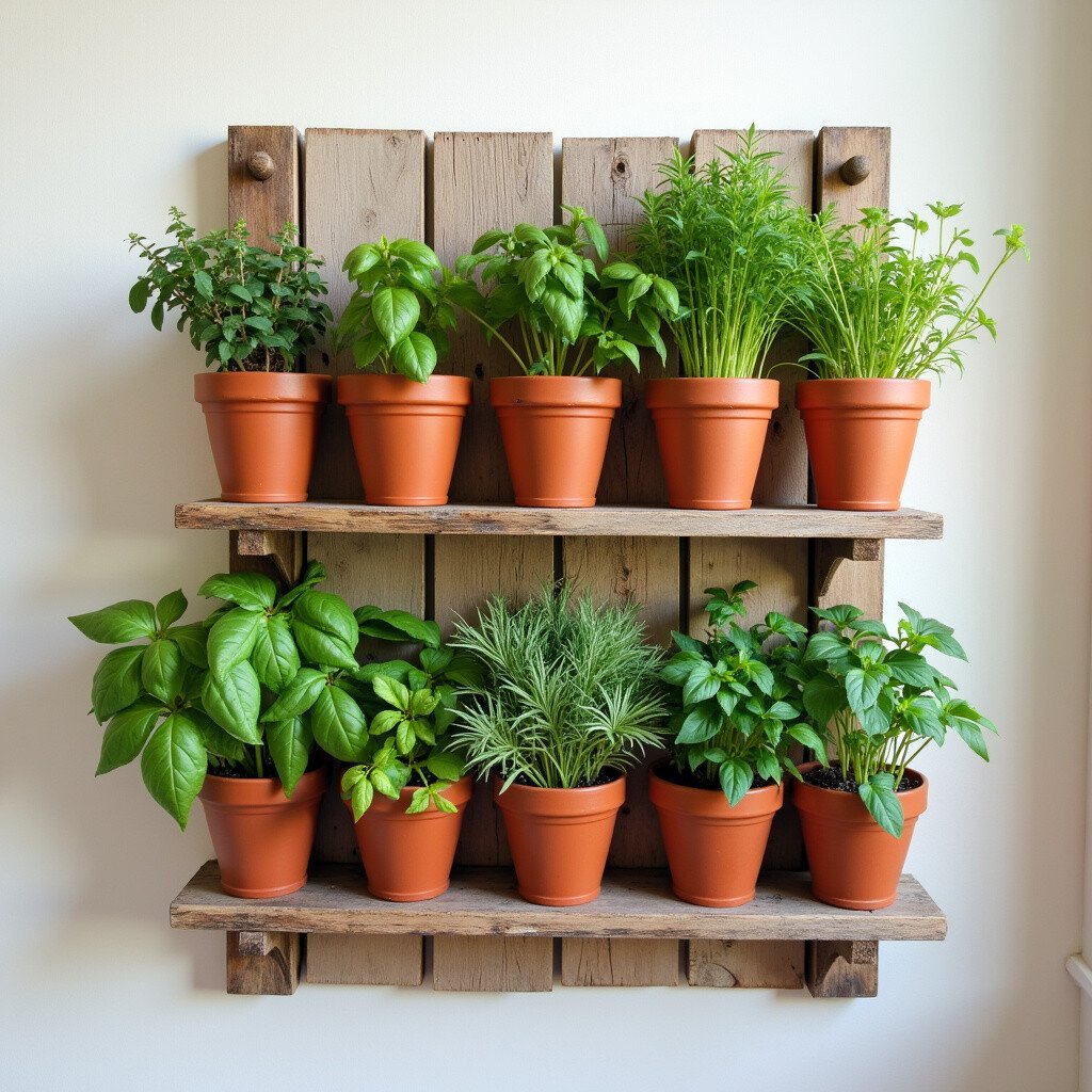 This wall hanging combines beauty with functionality. A series of small terracotta pots attached to a rustic wooden shelf creates a perfect space for growing herbs.