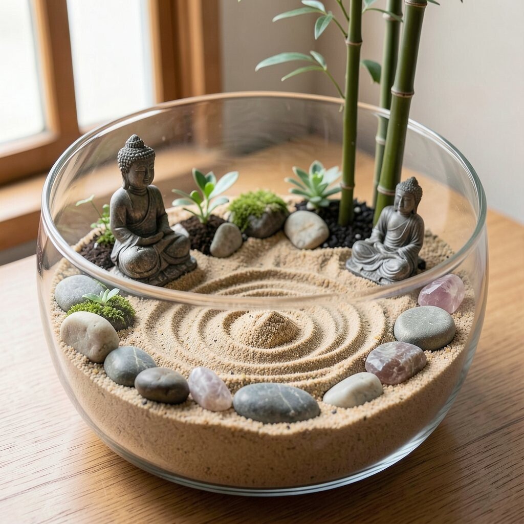 Personalize with smooth stones or crystals you find meaningful. Costs are minimal since you only need sand and a few plants or stones. This style is timeless and always in trend for those seeking tranquility.