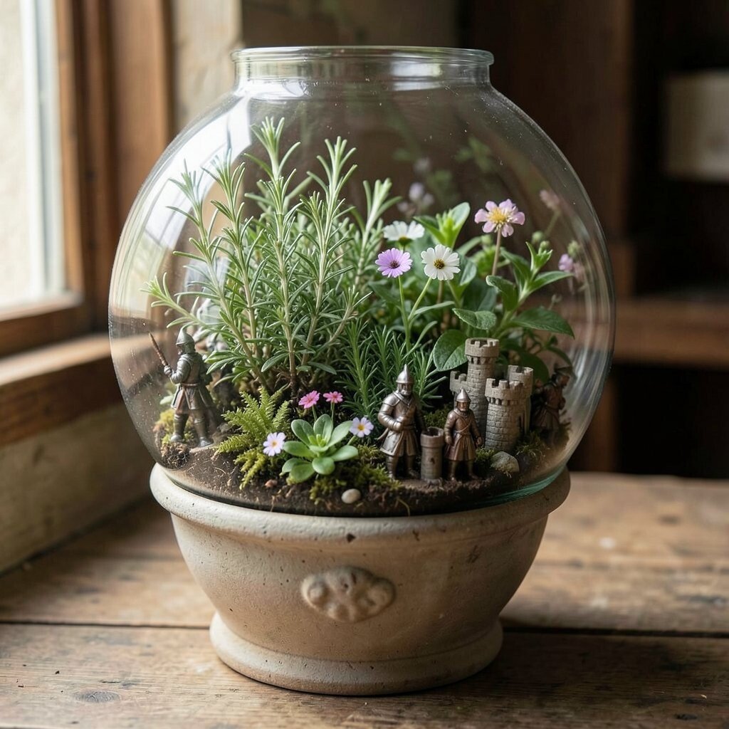 The combination of herbs and flowers creates a fragrant and beautiful display. Adding small knights or castle figurines can make it feel like a scene from history. It’s perfect for history buffs or anyone who loves unique decor.