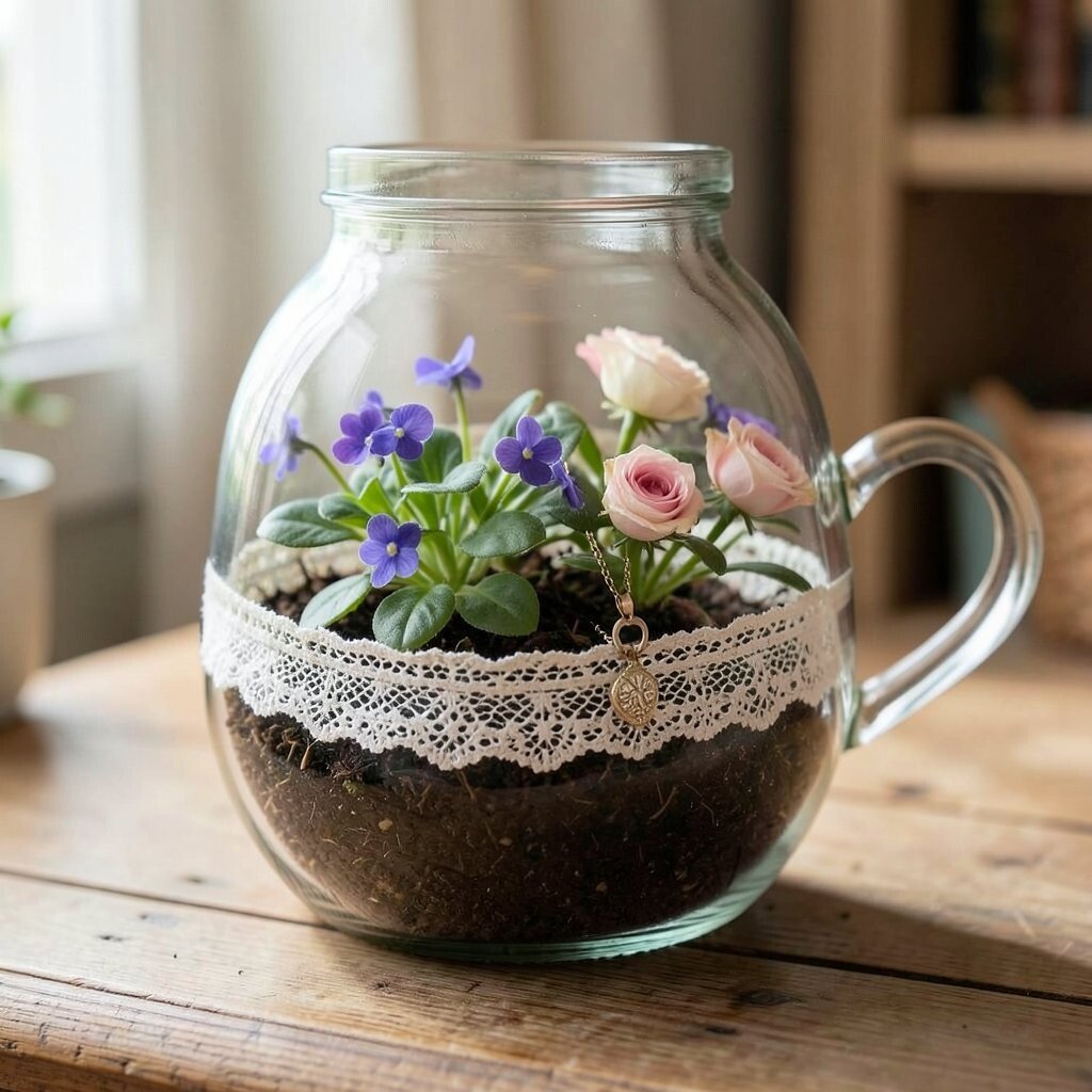 The elegance of vintage containers adds a unique touch to your terrarium. Adding lace or a small piece of jewelry can enhance the vintage feel. This setup is ideal for personal spaces like bedrooms or reading nooks.