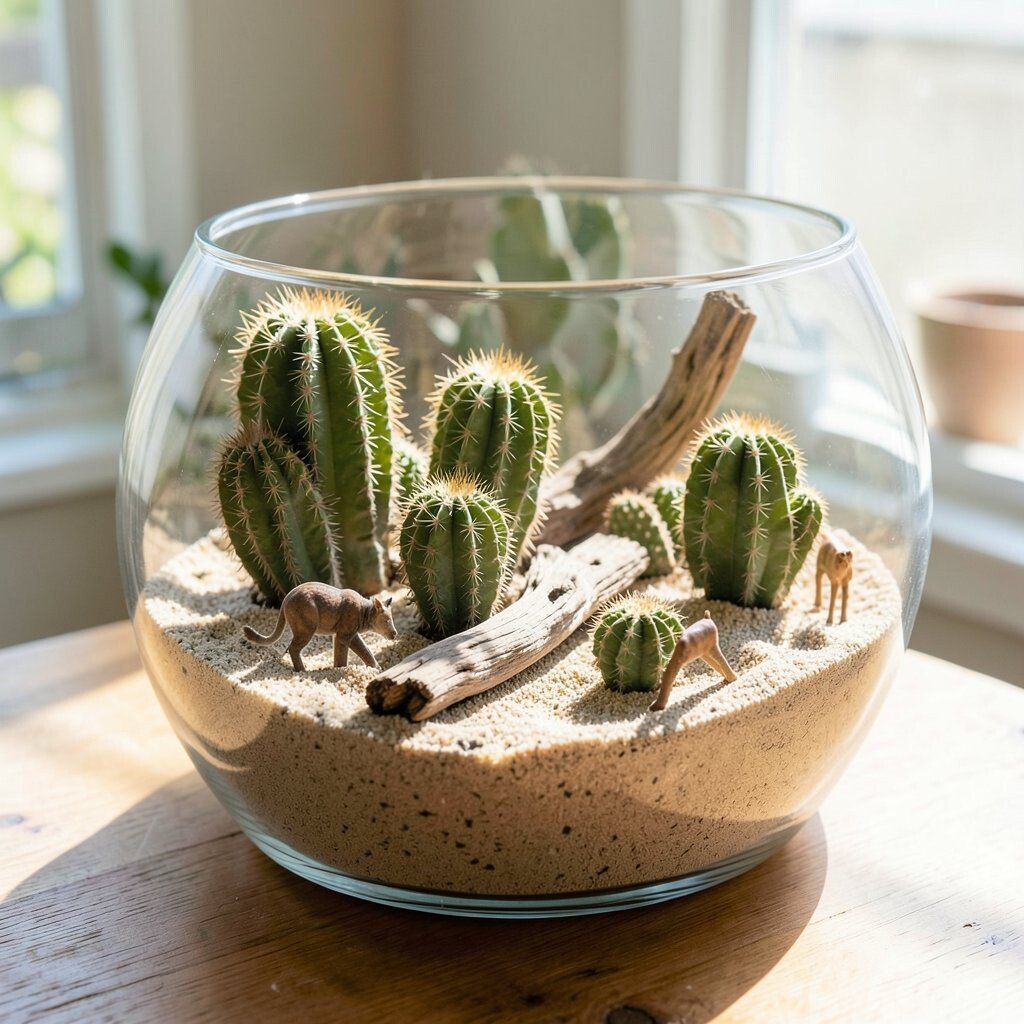 The striking contrast of green cacti against the neutral sand creates a stunning visual impact. Add some driftwood or small desert animal figurines to enhance the desert theme. This setup is great for sunny spots in your home.