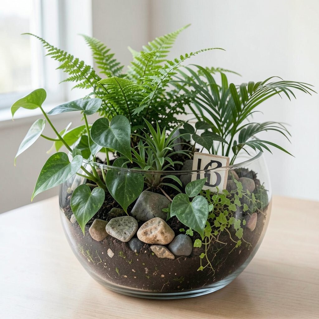 Combine various houseplants like pothos, ferns, and small palms for an urban jungle vibe. This terrarium is lush and full, perfect for adding green to modern spaces. Use a large container to give plants room to thrive.