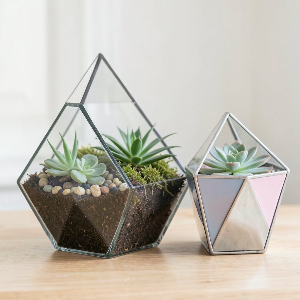 Use geometric containers to create modern, stylish terrariums. Air plants or succulents work well with this look, offering clean lines and simple beauty. It’s a hit with those who love contemporary design.