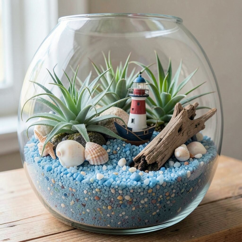 Air plants don’t need soil, making them easy to arrange and care for. This setup is unique because it combines elements of land and sea. Adding a small lighthouse or ship figurine enhances the nautical theme.