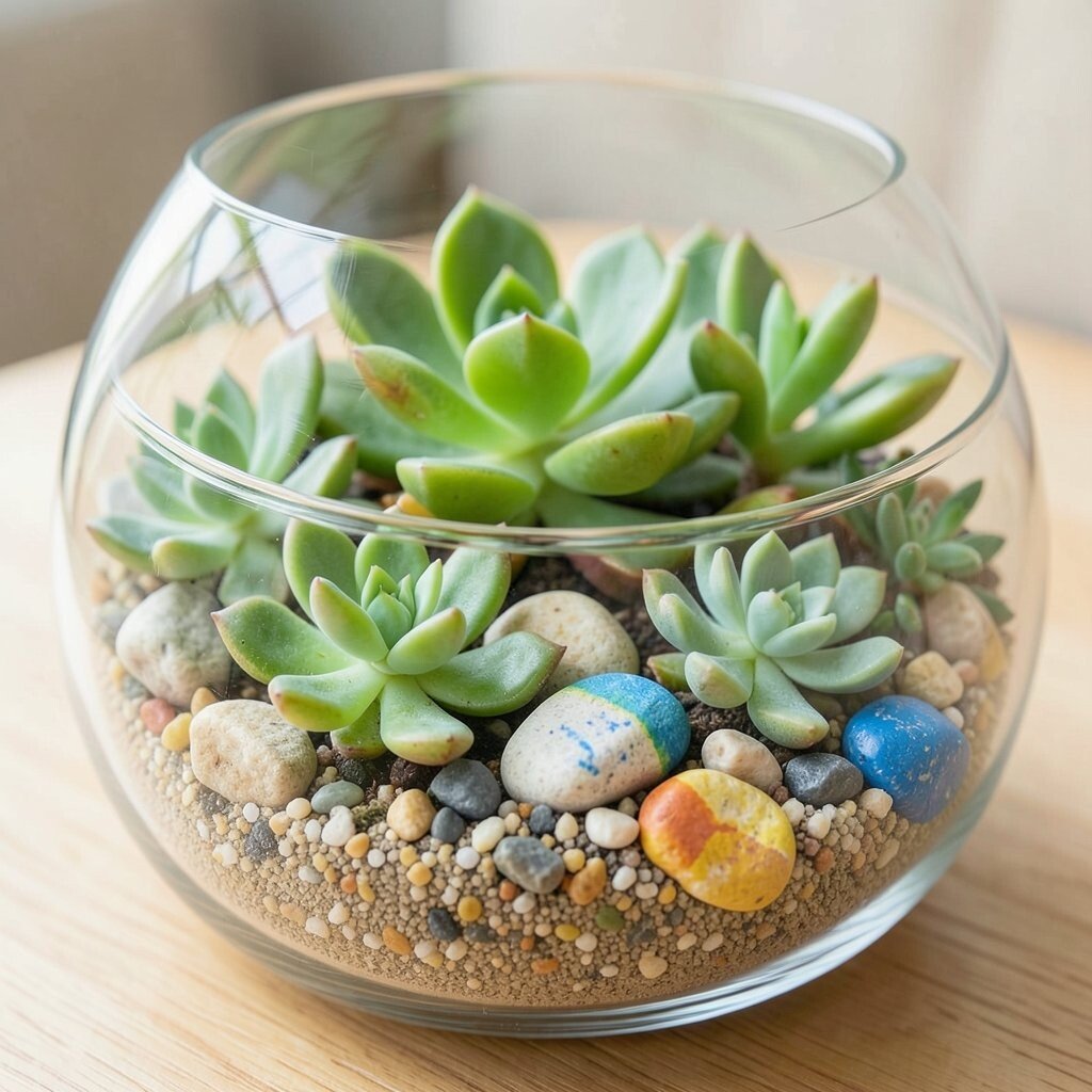 With their variety of forms, succulents can make your terrarium look like a mini desert landscape. Adding some sand or small rocks enhances this look, providing contrast against the green. You can even paint the rocks for a pop of color.