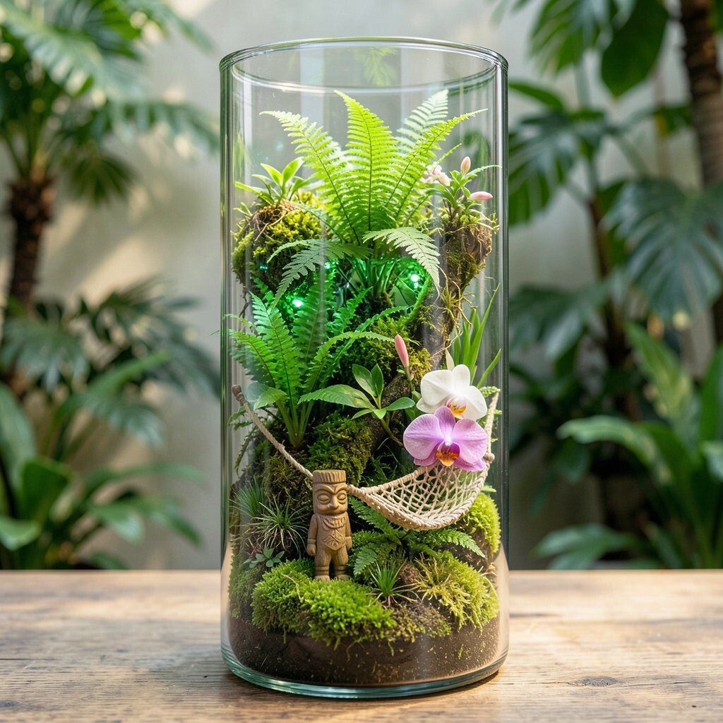 Transport yourself to a tropical island with ferns, orchids, and bright mosses. This terrarium bursts with vibrant greens and hints of exotic blooms. Use a tall glass container to give your plants room to grow upwards.