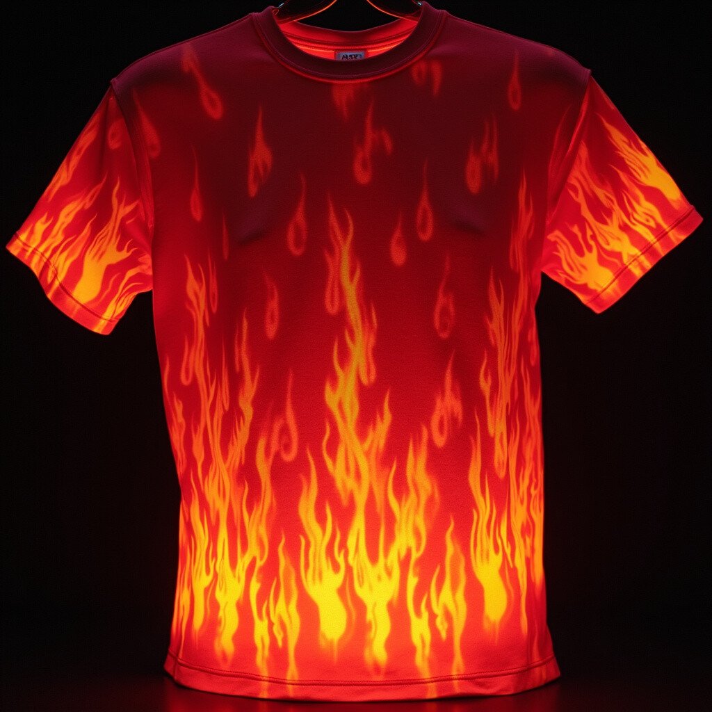 Feel the heat with fluorescent flames that dance across your shirt. Neon reds, oranges, and yellows mimic the look of blazing fire.