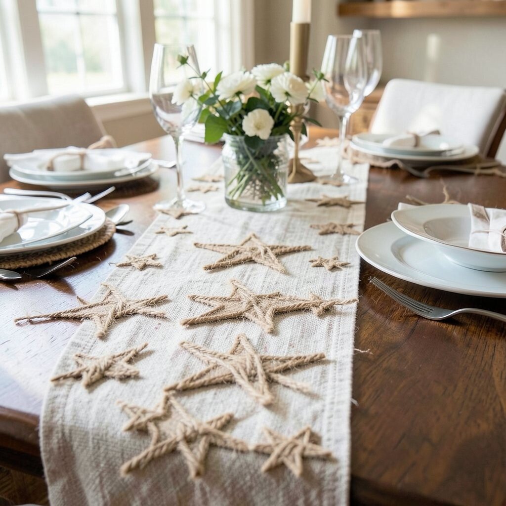 Cut out star shapes from fabric, then wrap with twine to create a series of stars. Attach them in a row to form a runner. The rustic look pairs beautifully with any tableware.