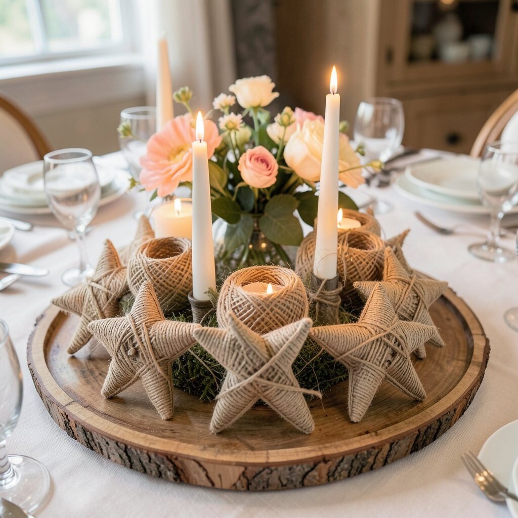 Create a base using a large piece of wood or a tray, then arrange twine stars of various sizes in the center. Add candles, flowers, or other decorative elements to complete the look.
