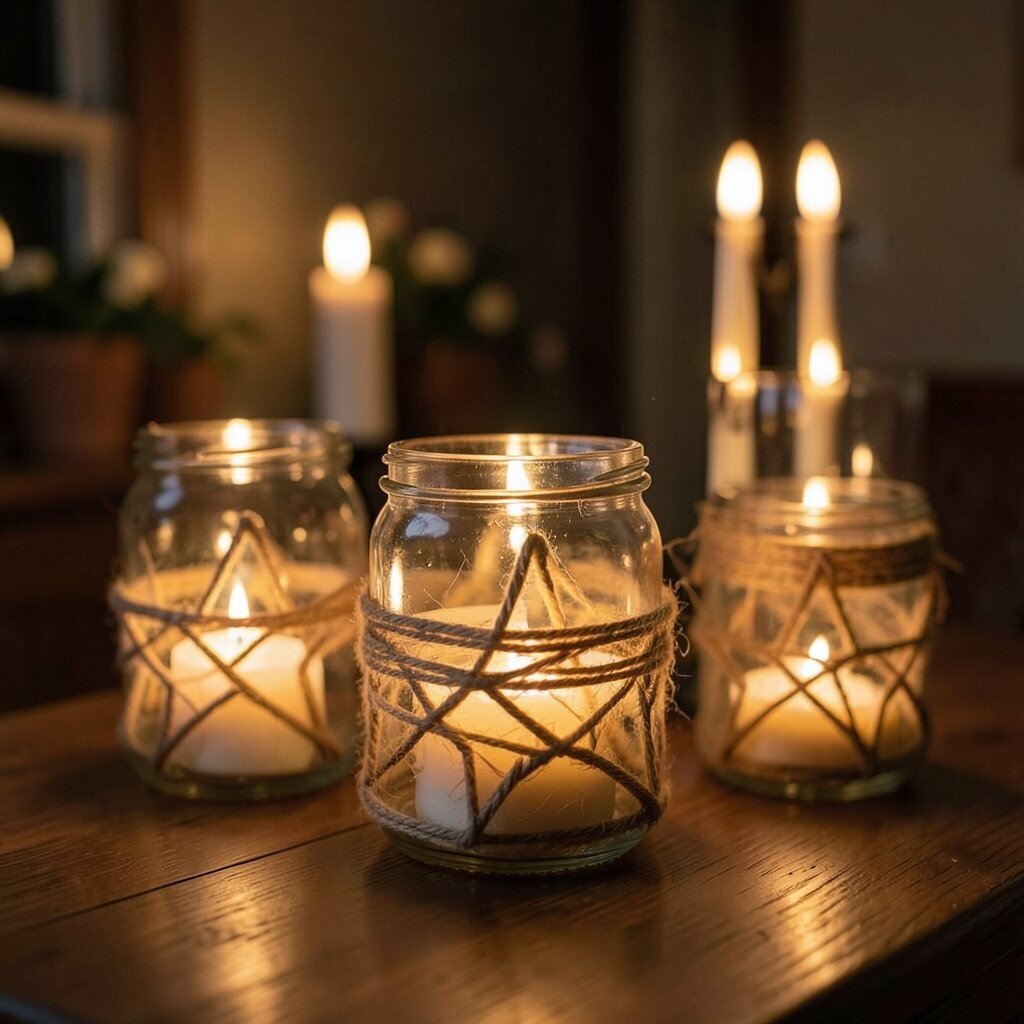 To create these, wrap twine around glass jars and form star patterns. Secure the twine with glue and let it dry before placing a candle inside. The effect is enchanting, as the light filters through the spaces between the twine.