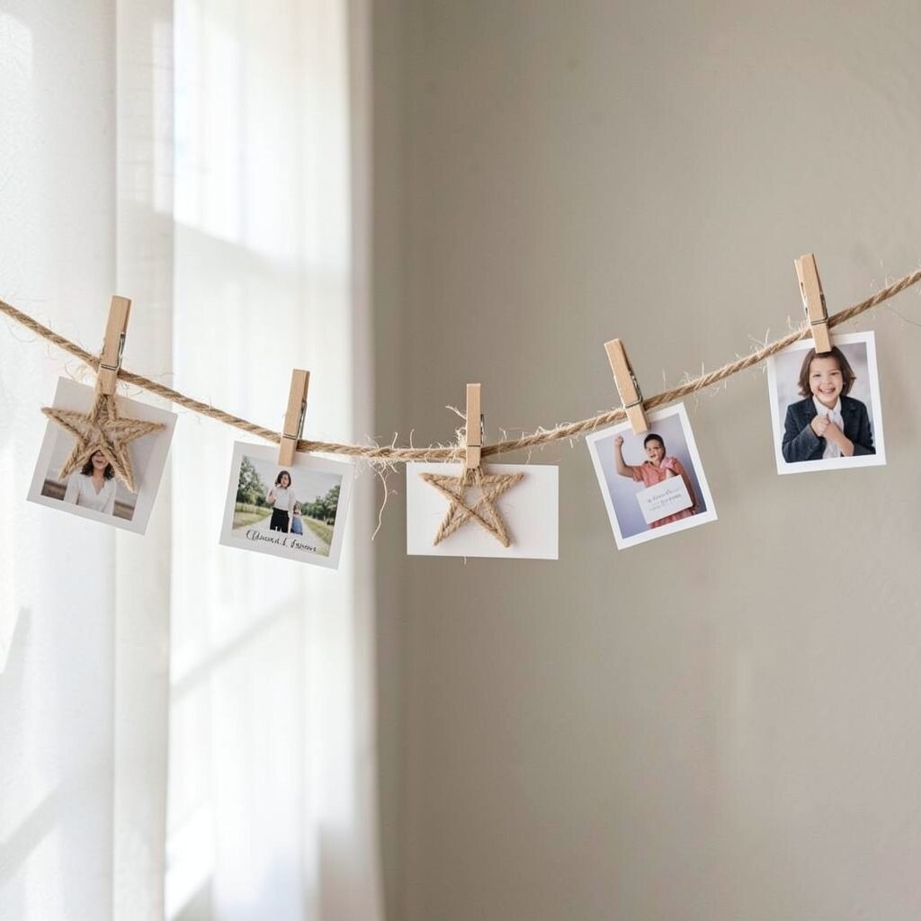 Showcase your favorite memories with a twine star photo clip string. This unique decor piece adds a touch of rustic charm to any space.