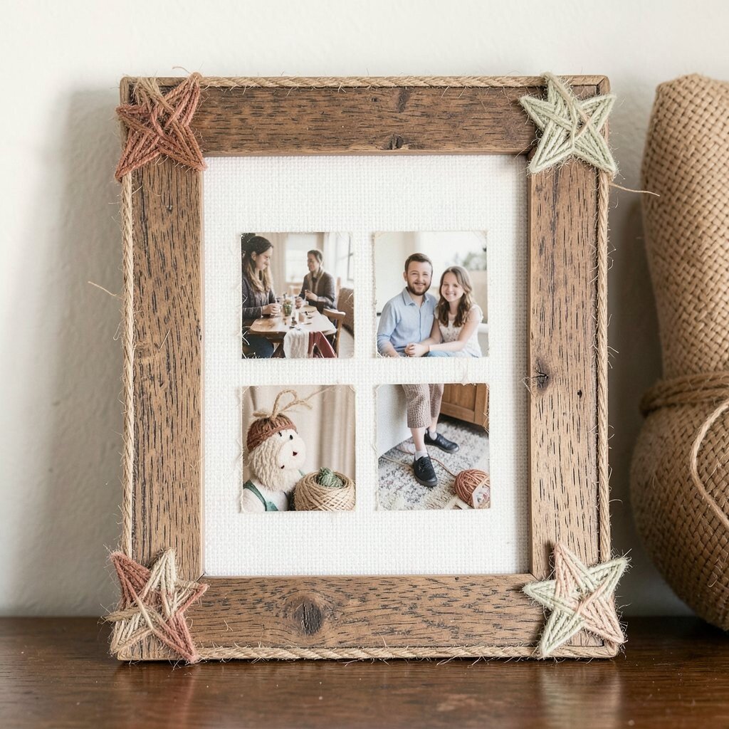 Wrap twine around the edges of a wooden frame, then attach small twine stars to the corners. The result is a unique frame that stands out on any shelf or wall.