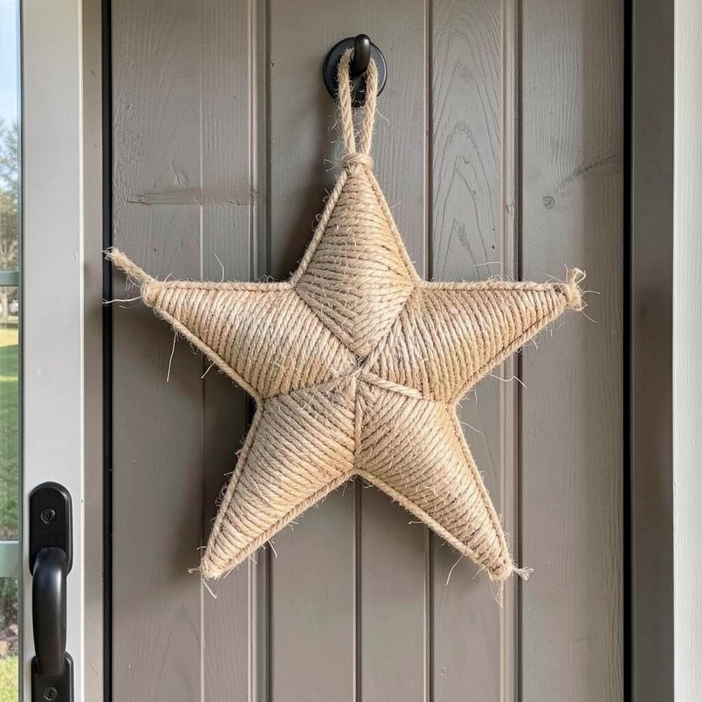 Welcome guests with a twine star door hanger. This charming decor piece adds a touch of rustic elegance to your entryway.