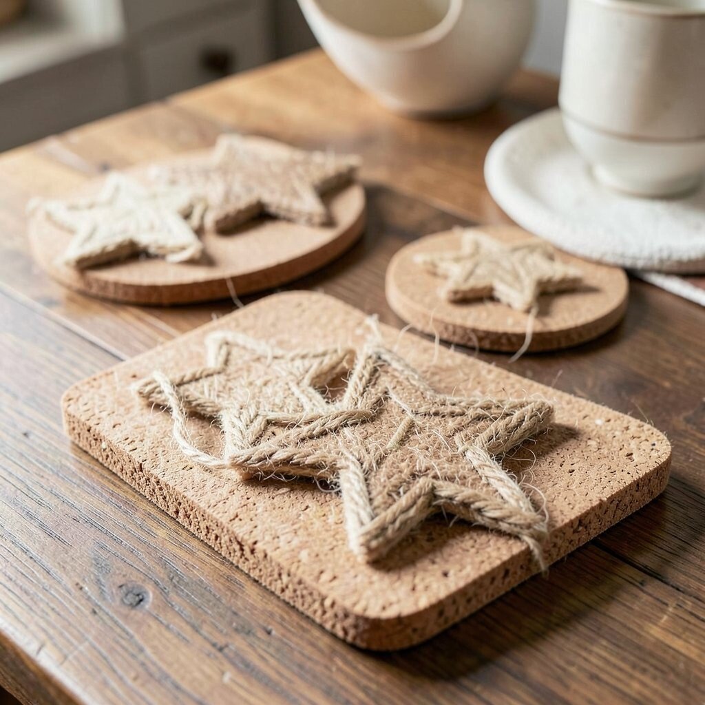 Create small twine stars and attach them to a cork or felt base. The result is a set of coasters that are both practical and beautiful.