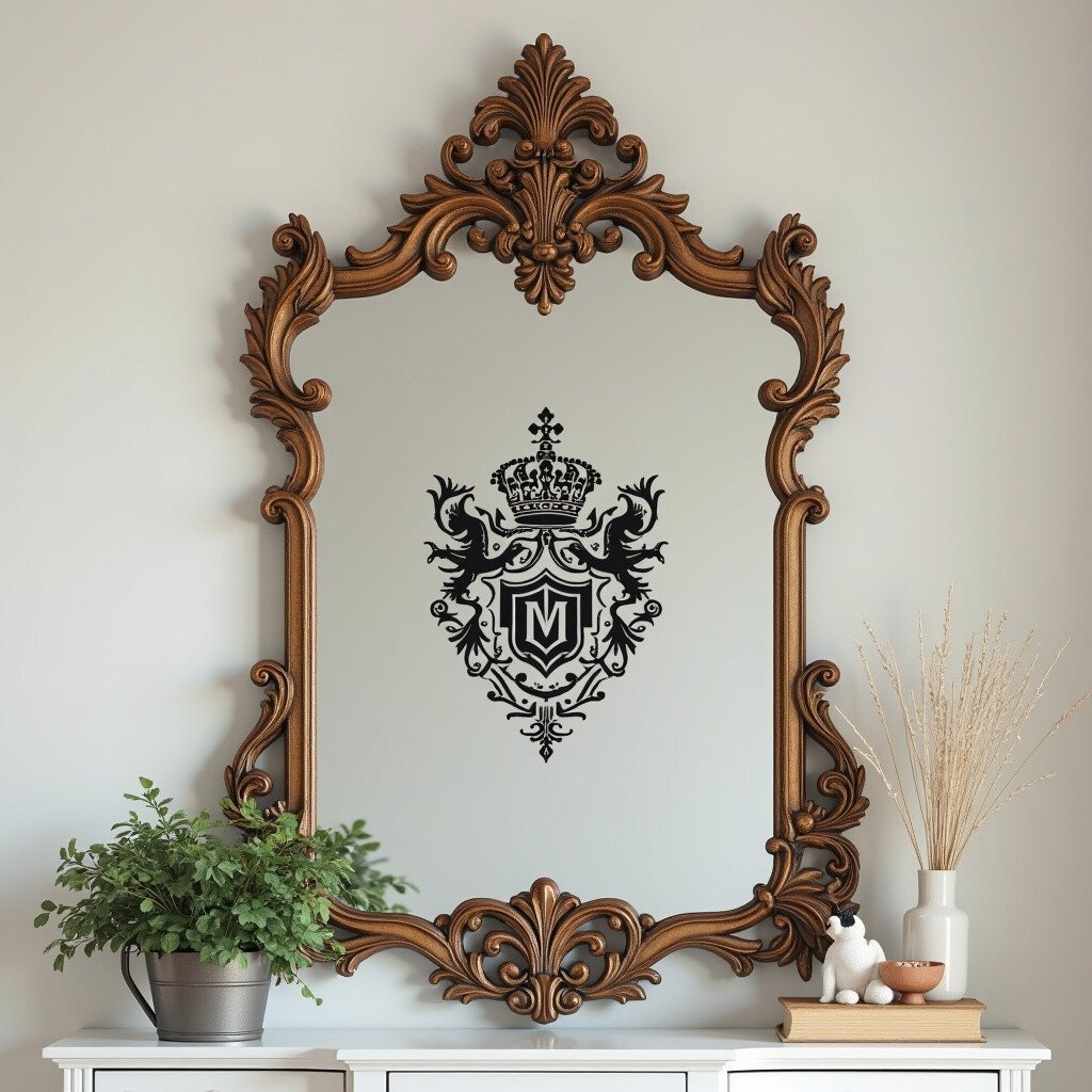Create a royal ambiance with a vintage crest stencil on your mirror. Think family crests, shields, or historic emblems. This idea adds a sense of heritage and pride to your space.