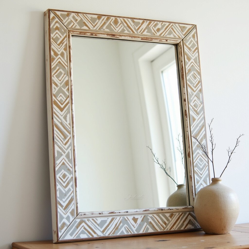Infuse your space with culture by using tribal stencils on a vintage mirror. These patterns can include zigzags, arrows, or traditional motifs. They add an exotic and earthy feel to any decor.