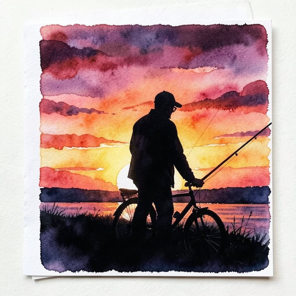 Imagine a card where the sun sets in a blaze of colors, casting a shadowy silhouette of Dad’s favorite hobby. This idea is perfect if your dad loves nature or has a special interest, like fishing or cycling.